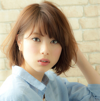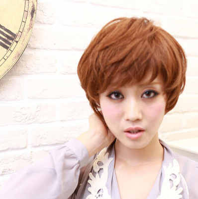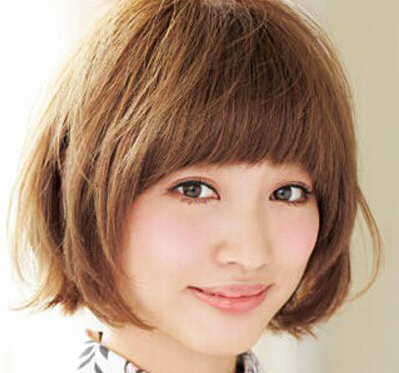 齐刘海黄棕色短发加上花衬衣就是一个精灵伶俐的小女生,甜美女孩必备发型之一。