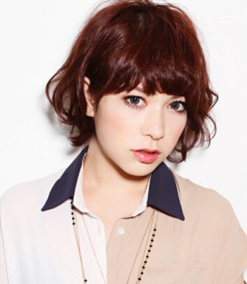 无规律的刘海,随意电卷的发尾制造出蓬松感,加上浅酒红色的染烫使头发更具层次感,时尚大方。